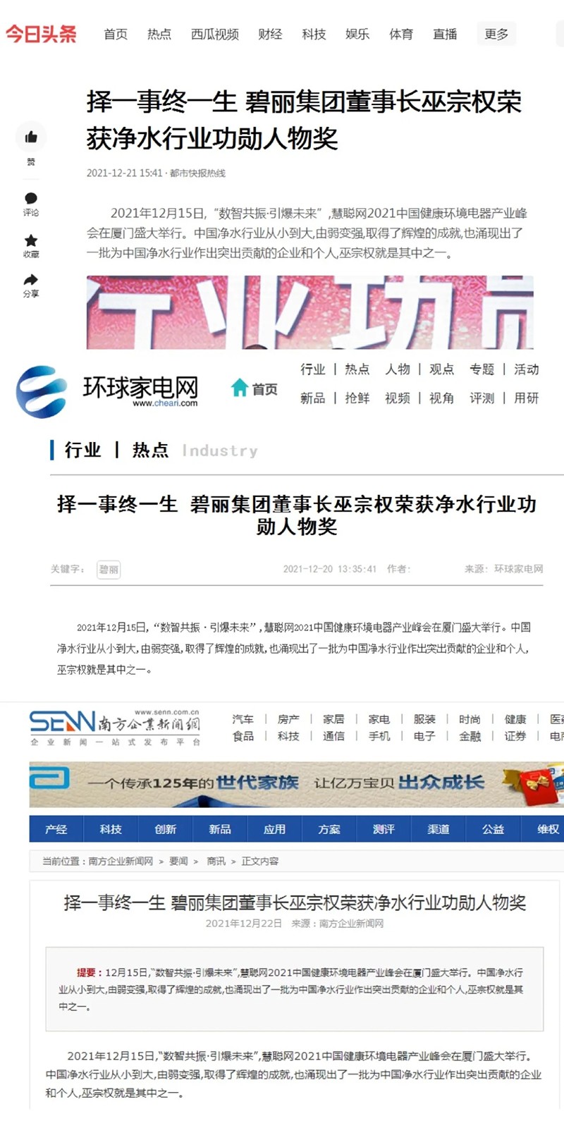 搜狐網(wǎng)、今日頭條、騰訊新聞、南方企業(yè)新聞網(wǎng)、中華網(wǎng)快訊、現(xiàn)代家電網(wǎng)等平臺深度報道了碧麗創(chuàng)始人巫宗權(quán)先生在凈水路上的心路歷程,其不為繁華易匠心的高尚品質(zhì)值得被贊頌。