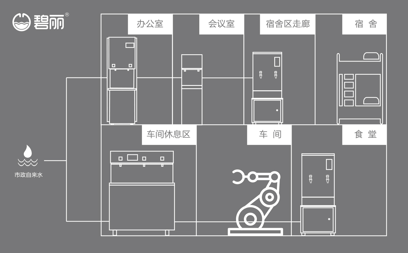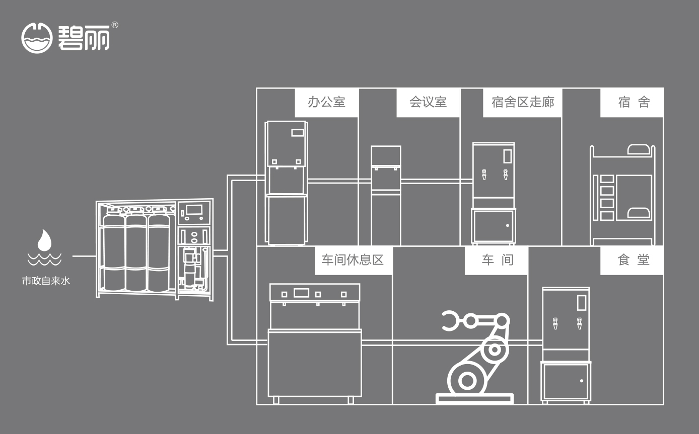 碧麗商用反滲透純水機將自來水集中處理后,把優(yōu)質(zhì)的純凈水通過專用的供水管道輸送到各飲水點;