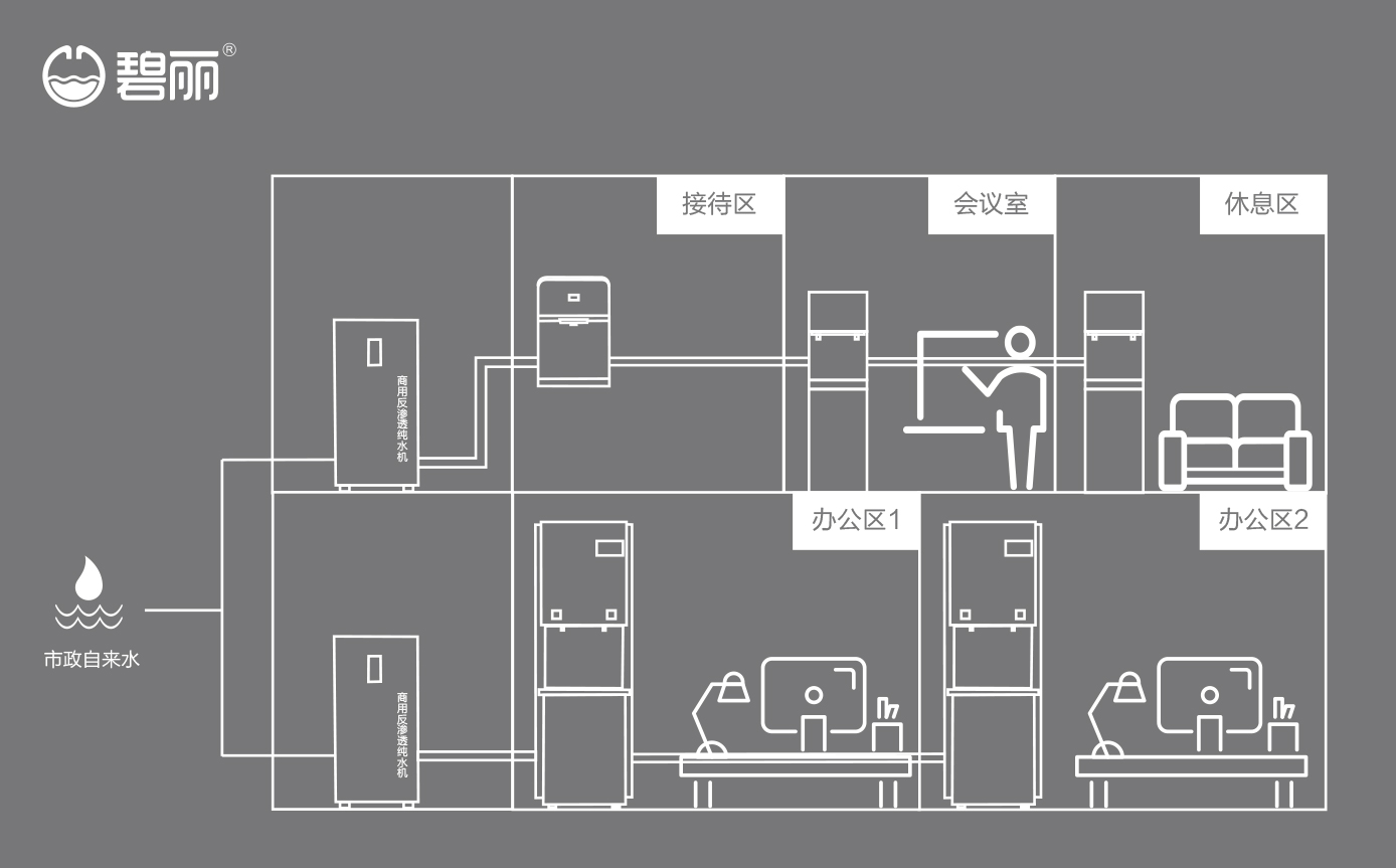 碧麗商用反滲透純水機(jī)將自來(lái)水集中處理后,把優(yōu)質(zhì)的純凈水通過(guò)專用的供水管道輸送到各飲水點(diǎn);