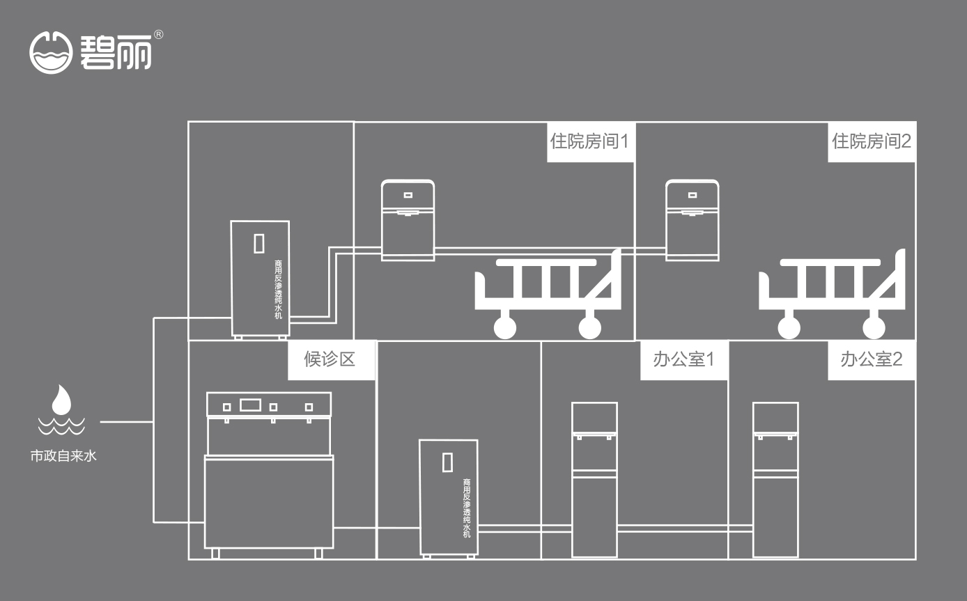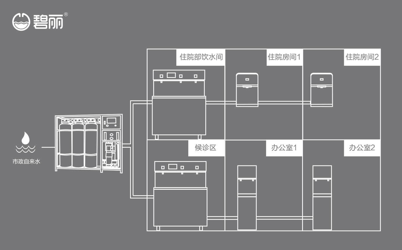 碧麗商用反滲透純水機將自來水集中處理后,把優(yōu)質(zhì)的純凈水通過專用的供水管道輸送到各飲水點;