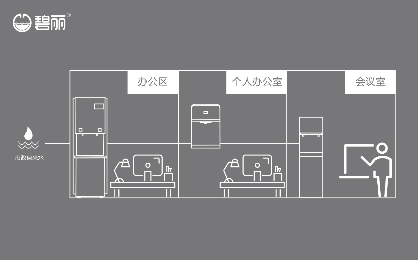 碧麗租賃商用反滲透純水機(jī)將自來水集中處理后,把優(yōu)質(zhì)的純凈水通過專用的供水管道輸送到各飲水點(diǎn);